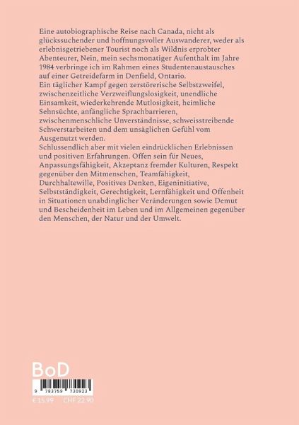 Eine autobiographische Reise nach Canada, nicht als glückssuchender und hoffnungsvoller Auswanderer, weder als erlebnisgetriebener Tourist noch als Wildnis erprobter Abenteurer, Nein, mein sechsmonatiger Aufenthalt im Jahre 1984 verbringe ich im Rahmen eines Studentenaustausches auf einer Getreidefarm in Denfield, Ontario.Ein täglicher Kampf gegen zerstörerische Selbstzweifel, zwischenzeitliche Verzweiflungslosigkeit, unendliche Einsamkeit, wiederkehrende Mutlosigkeit, heimliche Sehnsüchte, anfängliche Sprachbarrieren, zwischenmenschliche Unverständnisse, schweisstreibende Schwerstarbeiten und dem unsäglichen Gefühl vom Ausgenutzt werden.Schlussendlich aber mit vielen eindrücklichen Erlebnissen und positiven Erfahrungen. Offen sein für Neues, Anpassungsfähigkeit, Akzeptanz fremder Kulturen, Respekt gegenüber den Mitmenschen, Teamfähigkeit, Durchhaltewille, Positives Denken, Eigeninitiative, Selbstständigkeit, Gerechtigkeit, Lernfähigkeit und Offenheit in Situationen unabdinglicher Veränderungen sowie Demut und Bescheidenheit im Leben und im Allgemeinen gegenüber den Menschen, der Natur und der Umwelt.