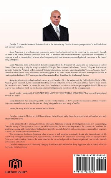 Canada a Nation in Motion is a bold look at issues facing Canada today from the perspective of a Canadian who truly understands the issues. In his special blend of analysis, humor and wit, Samy Appadurai offers up an intelligent discussion of issues ranging from the history of immigration in Canada, the G20 Summit and the Vancouver Olympics to the position of Canada on the world stage. Along with masterful storytelling, Samy provides a detailed analysis and commentary on each subject he covers in a way that anyone can easily understand. The perspective that Samy Appadurai takes is one of a well respected community leader who has dedicated his life to not only serving his community, but also his country. His belief in the importance of learning about the issues that face Canada as a nation is clear. However, he is not afraid to take a stand and provide an alternative point of view in order to spark conversation and debate. Canada is a country that is constantly changing from within and without but Samy Appadurai tells us exactly what it is that keeps Canada moving.