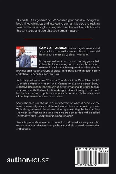 Samy Appadurai has once again taken a bold approach to an issue that we as citizens of the world hear about almost daily; global migration. Samy Appadurai is an award-winning journalist, columnist, broadcaster, consultant and community worker. It is with this background in mind that he provides an in-depth analysis of global immigration, immigration history and where Canada fits into this issue. As in his previous books "Canada: The Meat of the World Sandwich", "Canada a Nation in Motion" and "Canada-An Evolving Vision" Samy's extensive knowledge particularly about international relations feature very prominently. His love for Canada again shines through in this book but he is not afraid to point out where this country is falling short and where improvements need to be made. Samy also takes on the issue of misinformation when it comes to the issue of mass migration and the unfounded fears expressed by some. With his signature wit, he refutes critics by presenting the facts as they are which is refreshing in a time when we are bombarded with so called "alternative facts" about migrants and refugees. Samy Appadurai's masterful storytelling helps make a very complex subject easy to understand and yet he is not afraid to spark conversation and debate.