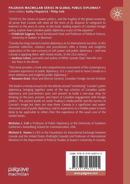 This book is a timely resource for the debate around "revitalizing" Canada's public diplomacy, bringing together some of the top scholars of Canadian public diplomacy and practitioners past and present to build a one-stop shop for thinking on the past, present, and future of Canadian engagement with foreign publics. The volume builds on Justin Trudeau's media profile and the success of Canada's image in 2016 but does not stop at the Niagara frontier post. Canada is a significant and under-discussed case of public diplomacy, and its experience as a middle power is more likely to be applicable to others than the experience of the usual case of the United States. Offering a comprehensive discussion of a major non-US case in contemporary public diplomacy and soft power, contributors also explore new angles of public diplomacy, including city, gift, art, and archaeological diplomacy as well as digital diplomacy.