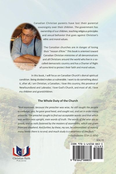Canadian Christian parents have lost their parental sovereignty over their children. The government has ownership of our children, teaching religious principles and sexual behaviour that goes against Christian's ethic and moral values. The Canadian churches are in danger of losing their "reason d'être." This book is oriented toward Canadian Christian ministries of all denominations and all Christians around the world who live in a so-called democratic country and has a Charter of Right of some kind to protect their faith and moral values. In this book, I will focus on Canadian Church's dismal spiritual condition. Being divided makes us vulnerable. I want to do something about it, after all, I am Christian, a Canadian, I love this country, this province of Newfoundland and Labrador, I love God's Church, and most of all, I love my children and grandchildren. The Whole Duty of the Church "And moreover, because the preacher was wise, he still taught the people knowledge; yea, he gave good heed, and sought out, and set in order many proverbs. The preacher sought to find out acceptable words: and that which was written was upright, even words of truth. The words of the wise are as goads, and as nails fastened by the masters of assemblies, which are given from one shepherd. And further, by these, my son, be admonished: of making many books there is no end; and much study is a weariness of the flesh." Ecclesiastes 12:9-12 (KJV)