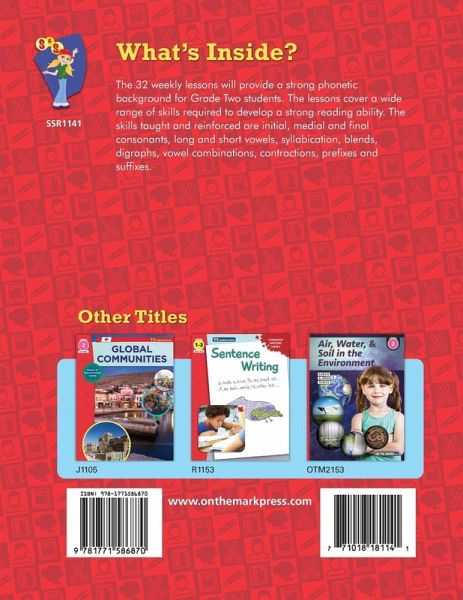 32 weekly lessons provide a strong phonetic background. The lessons cover a wide range of skills needed to develop strong reading skills. The teaching plans and activity sheets can be used on a weekly basis or the ideas and worksheets can be used to suit students needs or they could be used for teaching ideas, reinforcing students' phonetic skills, and home study. Each weekly plan contains an : ¿ Objective ¿ Teacher Information ¿ Daily Planning Ideas containing games, listening activities, stories and riddles. ¿ A Picture Key is provided for each worksheet that has pictures so they can be identified. ¿ Four Weekly Activity Worksheets focus on the concept(s) taught during the week. ¿ Weekly Tests are provided and could be held on the last day of the week or when it is necessary. Sequential Development of Skills Week 1: Review Upper and Lower Case Letters of the Alphabet Week 2: Initial Consonant Review Week 3: Final Consonant Review Week 4: Initial and Final Consonants Week 5: Single Medial Consonants; Middle and Final Double Consonants Week 6: Short Vowel Sounds 'Aa' and 'Ii' Week 7: Recognition of the Short Vowel 'Uu' Week 8: Introduction of Short Vowel 'Oo'; Review of Short Vowels 'a,e,i,u' Week 9: Review of Short Vowels 'a,e,i,o,u' Week 10: Introduction of Long Vowel Sounds - a,e,i,o,u Week 11: Long and Short Vowels in Compound Words Week 12: Syllabication in Regular and Compound Words Week 13: Long and Short Vowel Sounds of 'Yy' Week 14: Initial Consonant Blends: sl, st, sk, sp, sm, sn, sw Week 15: Initial Consonant Blends: cl, bl, fl, gl, pl, sl Week 16: Initial Consonant Blends: br, cr, dr, fr, gr, pr, tr Week 17: Inital and Final Digraphs: sh, ch, wh, th Week 18: Final Digraphs: ph, gh, ck, ng Week 19: 'R' Controlled Vowels: ar, er, ir, or, ur Week 20: Hard and Soft 'Cc' and 'Gg' Week 21: Regular Double Vowels 'ai' and 'ay' Week 22: Long 'e' Vowel Digraphs: 'ee, ea' Week 23: Long 'i' Digraphs: igh, ie Week 24: Vowel Digraphs 'oa, oe, ow, ue, ew' Week 25: Vowel Digraph, Review Week 26: Diphthongs 'ou, ow, oi, oy' Week 27: The Two Sounds Made by 'oo' Week 28: Silent Consonants 'k, w, l, b' Week 29: Contractions Week 30: Irregular Double Vowels: oo, ea, oi, oy, ow Week 31: Prefixes 're, un, dis' Week 32: Suffixes 's, es, ed, ing'