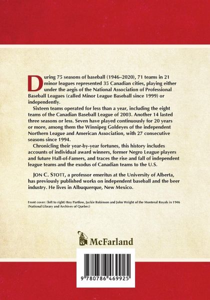 During 75 seasons of baseball (1946-2020), 71 teams in 21 minor leagues represented 35 Canadian cities, playing either under the aegis of the National Association of Professional Baseball Leagues (called Minor League Baseball since 1999) or independently. Sixteen teams operated for less than a year, including the eight teams of the Canadian Baseball League of 2003. Another 14 lasted three seasons or less. Seven have played continuously for 20 years or more, among them the Winnipeg Goldeyes of the independent Northern League and American Association, with 27 consecutive seasons since 1994. Chronicling their year-by-year fortunes, this history includes accounts of individual award winners, former Negro League players and future Hall-of-Famers, and traces of the rise and fall of independent league teams and the exodus of Canadian teams to the U.S.