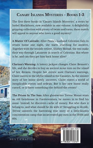 The first three books in 'Canary Islands Mysteries', a series by Isobel Blackthorn, now available in one volume. A delightfully gripping collection with plenty of twists and turns, these novels will appeal to anyone who loves a good mystery! A Matter Of Latitude: After Paula's husband Celestino fails to return home one night, she starts searching for answers. Together with the trouble retiree, Shirley Mobad, the two make their way through Lanzarote in search of Celestino. But where is he, and can they get him back home alive? Clarissa's Warning: A lottery jackpot changes Claire Bennett's life, and she decides to buy an ancient stone ruin on the island of her dreams. Despite her mystic aunt Clarissa's warnings, Claire moves to the idyllic island in the Canaries. As the sinister story of her home slowly uncovers, Claire enters a world of inexplicable events and ordeals. But is her new home really cursed, or is there something else behind the events? The Prison In The Sun: After ghostwriter Trevor Moore rents an old farmhouse in Fuerteventura, he moves in to find his muse. Instead, he discovers cache of money. But who does it belong to, and what should he do with it? Struggling to decide, Trevor unravels the harrowing true story of a little-known concentration camp that incarcerated gay men in the 1950s and 60s.