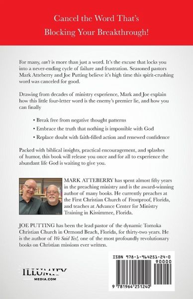 For many, can't is more than just a word. It's the excuse that locks you into a never-ending cycle of failure and frustration. Seasoned pastors Mark Atteberry and Joe Putting believe it's high time this spirit-crushing word was canceled for good. Drawing from decades of ministry experience, Mark and Joe explain how this little four-letter word is the enemy's premier lie, and how you can finally Break free from negative thought patterns Embrace the truth that nothing is impossible with God Replace doubt with faith-filled action and renewed confidence Packed with biblical insights, practical encouragement, and splashes of humor, this book will release you once and for all to experience the abundant life God is waiting to give you.