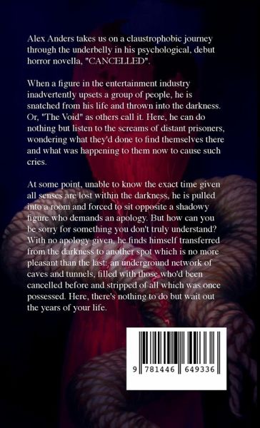 Cancel culture is rife. When a person puts a foot wrong, be it intentional or not, the online community is quick to pounce and often unforgiving. Even if an apology is offered, the "wronged" party will be relentless in their ongoing campaign against those they perceive to be problematic. Like a virus, it spreads. More people come forward sharing their own horror stories of the supposed perpetrator while adding to the drama with extra, made-up snippets of information so as to make things appear even juicier. With pitchforks lit, the community marches against the perpetrator. While some try and stand their ground against such crowds, with toxic messages and posts thrown against them on a daily basis, most are pushed back and soon disappear. But what becomes of those who are "successfully" cancelled? Alex Anders takes us on a claustrophobic journey through the underbelly in his psychological, debut horror novella, "CANCELLED". When a figure in the entertainment industry inadvertently upsets a group of people, he is snatched from his life and thrown into the darkness. Or, "The Void" as others call it. Here, he can do nothing but listen to the screams of distant prisoners, wondering what they'd done to find themselves there and what was happening to them now to cause such cries. At some point, unable to know the exact time given all senses are lost within the darkness, he is pulled into a room and forced to sit opposite a shadowy figure who demands an apology. But how can you be sorry for something you don't truly understand? With no apology given, he finds himself transferred from the darkness to another spot which is no more pleasant than the last: an underground network of caves and tunnels, filled with those who'd been cancelled before and stripped of all which was once possessed. Here, there's nothing to do but wait out the years of your life. He refuses to die down here. With thoughts of his family locked firmly to the front of his mind, he knows he will never stop until he finds a way up and out of whatever Hell this place is... Cancelled or not, he's going home.