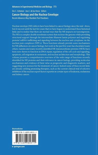 Section I: History and use of the nuclear envelope in cancer prognosis: Overview and perspective.- Cancer and the nuclear envelope, a history and perspective.- The role of the nuclear lamina in cancer and apoptosis.- The diagnostic pathology of the nuclear envelope in human cancers.- Nuclear morphometry, epigenetic changes, and clinical relevance in prostate cancer.- "To be or not to be in good shape": diagnostic and clinical value of nuclear shape irregularities in thyroid and breast cancer.- Section II: The nuclear envelope in cell cycle regulation and signaling.- pRb and lamins in cell cycle regulation and aging.- Lamina-associated polypeptide (LAP)2a and other LEM proteins in cancer biology.- NETs and cell cycle regulation.- Nuclear envelope regulation of signaling cascades.- Section III: Nuclear envelope regulation of the genome.- Nuclear envelope - connecting structural genome organization to regulation of gene expression.- Studying lamins in invertebrate models.- Lamin organization of chromosome positioning.- Section IV: Functions of the NPC in cancer.- NPC proteins linked in cancer overview.- Roles of the nucleoporin Tpr in cancer and aging.- Ran GTPase in nuclear envelope formation and cancer metastasis.- Wnt signaling proteins associate with the nuclear pore complex: implications for cancer.- Section V: The nuclear envelope in DNA damage and stress responses.- DNA damage and lamins.- Repo-Man at the intersection of chromatin remodeling, DNA repair, nuclear envelope organization and cancer progression.- Lamines and oxygen stress damage in cell proliferation.- Section VI: The nuclear envelope link to cell migration and metastasis.- Nuclear mechanics in cancer.- Nuclear envelope in nuclear positioning and cell migration.- Nesprins in cell stability and migration.- Connecting the nucleus to the cytoskeleton for nuclear positioning and call migration.- Section VII: Towards a molecular explanation of prognostic links to the nuclear envelope.-Nuclear envelope invaginations and cancer.- Mechanisms of nuclear size regulation in model systems and cancer.- Control of nuclear size by NPC proteins.- Do lamins influence disease progression in cancer?.