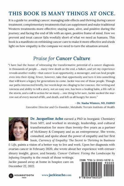 THIS BOOK IS MANY THINGS AT ONCE. It is a guide to: avoiding cancer; managing side effects and thriving during cancer treatment; complementary treatments that can supplement and make traditional Western treatments more effective; staying sane, alive, and positive during the journey; and facing the end of life with an open, positive frame of mind. How we prevent and treat cancer falls woefully short of what we need as humans. This book is a manifesto on rethinking cancer care to make it more effective and sheds light on how empathy is the compass we need to turn the situation around. All proceeds net of costs will be donated to the Jackie Acho Fund for Empathetic Cancer Care and will be used to support others who are on a cancer journey.