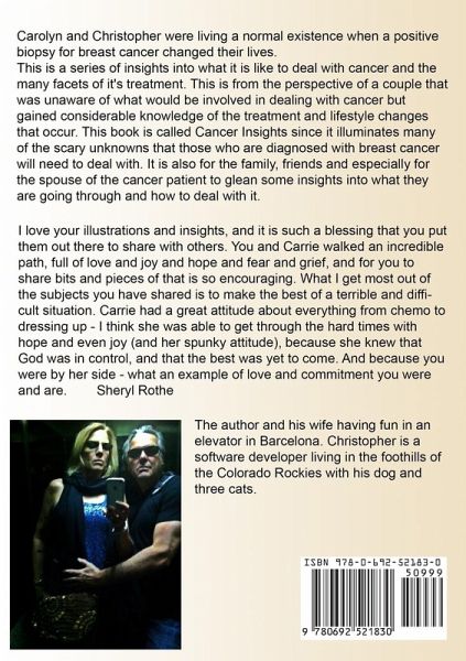 Carolyn and Christopher were living a normal existence when a positive biopsy for breast cancer changed their lives. This is a series of insights into what it is like to deal with cancer and the many facets of it's treatment. This is from the perspective of a couple that were unaware of what would be involved in dealing with cancer but gained considerable knowledge of the treatment and lifestyle changes that occur. This book is called Cancer Insights since it illuminates many of the scary unknowns that women who are diagnosed with beast cancer will need to deal with. It is also for the family, friends and especially for the spouse of the cancer patient to glean some insights into what she is going through and how to deal with it. The book is a graphic novel in a sense. In a sense because each page is focused on a particular issue, anditode or description of the common day to day things that a cancer patient and her spouse will deal with. The story is mostly told with images, drawn from real-life experiences of actual events as they occured. We receiced feedback on many of the pages from other cancer patients as the pages were created. That helped us to know that we were on track with many of the issues that the book deals with. You may read things that make you feel less alone, perhaps thinking "Hey, that happened to me too!". We grew a lot individually and together as a couple during our cancer journey and it helped bring us even closer together. This book is also a continuation of Carolyn's legacy since 50% of the profits of the book go directly to metastatic breast cancer research.