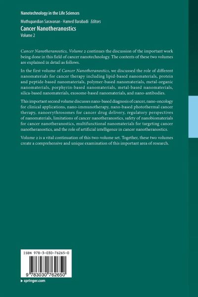 Cancer Nanotheranostics, Volume 2 continues the discussion of the important work being done in this field of cancer nanotechnology. The contents of these two volumes are explained in detail as follows. In the first volume of Cancer Nanotheranostics, we discuss the role of different nanomaterials for cancer therapy including lipid-based nanomaterials, protein and peptide-based nanomaterials, polymer-based nanomaterials, metal-organic nanomaterials, porphyrin-based nanomaterials, metal-based nanomaterials, silica-based nanomaterials, exosome-based nanomaterials, and nano-antibodies. This important second volume discusses nano-based diagnosis of cancer, nano-oncology for clinical applications, nano-immunotherapy, nano-based photothermal cancer therapy, nanoerythrosomes for cancer drug delivery, regulatory perspectives of nanomaterials, limitations of cancer nanotheranostics, safety of nanobiomaterials for cancer nanotheranostics, multifunctional nanomaterials for targeting cancer nanotheranostics, and the role of artificial intelligence in cancer nanotheranostics. Volume 2 is a vital continuation of this two-volume set. Together, these two volumes create a comprehensive and unique examination of this important area of research.