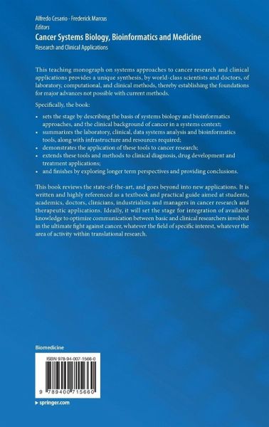 This teaching monograph on systems approaches to cancer research and clinical applications provides a unique synthesis, by world-class scientists and doctors, of laboratory, computational, and clinical methods, thereby establishing the foundations for major advances not possible with current methods. Specifically, the book: 1) Sets the stage by describing the basis of systems biology and bioinformatics approaches, and the clinical background of cancer in a systems context; 2) Summarizes the laboratory, clinical, data systems analysis and bioinformatics tools, along with infrastructure and resources required; 3) Demonstrates the application of these tools to cancer research; 4) Extends these tools and methods to clinical diagnosis, drug development and treatment applications; and 5) Finishes by exploring longer term perspectives and providing conclusions. This book reviews the state-of-the-art, and goes beyond into new applications. It is written and highly referenced as a textbook and practical guide aimed at students, academics, doctors, clinicians, industrialists and managers in cancer research and therapeutic applications. Ideally, it will set the stage for integration of available knowledge to optimize communication between basic and clinical researchers involved in the ultimate fight against cancer, whatever the field of specific interest, whatever the area of activity within translational research.