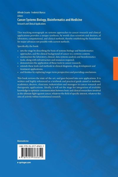 This teaching monograph on systems approaches to cancer research and clinical applications provides a unique synthesis, by world-class scientists and doctors, of laboratory, computational, and clinical methods, thereby establishing the foundations for major advances not possible with current methods. Specifically, the book: 1) Sets the stage by describing the basis of systems biology and bioinformatics approaches, and the clinical background of cancer in a systems context; 2) Summarizes the laboratory, clinical, data systems analysis and bioinformatics tools, along with infrastructure and resources required; 3) Demonstrates the application of these tools to cancer research; 4) Extends these tools and methods to clinical diagnosis, drug development and treatment applications; and 5) Finishes by exploring longer term perspectives and providing conclusions. This book reviews the state-of-the-art, and goes beyond into new applications. It is written and highly referenced as a textbook and practical guide aimed at students, academics, doctors, clinicians, industrialists and managers in cancer research and therapeutic applications. Ideally, it will set the stage for integration of available knowledge to optimize communication between basic and clinical researchers involved in the ultimate fight against cancer, whatever the field of specific interest, whatever the area of activity within translational research.