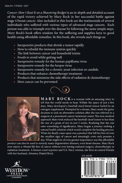 Cancer: How I Beat It on a Shoestring Budget is an in-depth and detailed account of the rapid victory achieved by Mary Rock in her successful battle against stage 4 breast cancer. This book includes testimonies of other individuals suffering with various types of advanced stage cancers. Each individual was able to triumph over the disease by following the same simple steps. Mary Rock's book offers wisdom for the suffering and supplies keys to good health using affordable remedies. In this book, she reveals such things as: ¿ Inexpensive products that shrink a tumor rapidly ¿ How to rebuild the immune system quickly ¿ The link between cancer and household toxins ¿ Foods to avoid while getting well ¿ Inexpensive remedy for the human papilloma virus ¿ Inexpensive remedy for the herpes virus ¿ Inexpensive remedy for a chronic yeast infection or candida ¿ The importance of maintaining a healthy colon ¿ How daily detoxification can contribute to life extension ¿ How