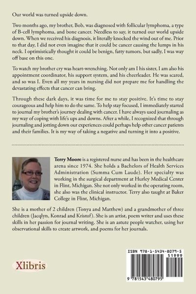 Our world was turned upside down. Two months ago, my brother, Bob, was diagnosed with follicular lymphoma, a type of B-cell lymphoma, and bone cancer. Needless to say, it turned our world upside down. When we received his diagnosis, it literally knocked the wind out of me. Prior to that day, I did not even imagine that it could be cancer causing the lumps in his neck. I optimistically thought it could be benign, fatty tumors, but sadly, I was way off base on this one. To watch my brother cry was heart-wrenching. Not only am I his sister, I am also his appointment coordinator, his support system, and his cheerleader. He was scared, and so was I. Even all my years in nursing did not prepare me for handling the devastating effects that cancer can bring. Through these dark days, it was time for me to stay positive. Its time to stay courageous and help him to do the same. To help stay focused, I immediately started to journal my brothers journey dealing with cancer. I have always used journaling as my way of coping with lifes ups and downs. After a while, I recognized that through journaling and jotting down our experiences could perhaps help other cancer patients and their families. It is my way of taking a negative and turning it into a positive.