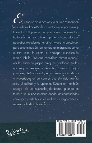 El universo de la poesía y la música se mezclan en este libro, libro donde los territorios genéricos están borrados. Un poema, un gran poema de estructura horizontal, en su primera parte, circundado por pequeños excedentes narrativos, y que no prescinde, para su terminación, de formas tan marginales como el mini texto, la viñeta, el apólogo, e incluso la misma fábula. "Mudas canciones zarastrunianas", así les llama su propio autor, se combinan en las noches para resolver ansiedades, carencias, bajas pasiones, desparramadas en un pentagrama urbano y orquestadas en un cosmos que el sujeto transita entre el aullido y la epifanía. Redención, también castigo, de un muchacho de barrio, girando en torno a un mundo insomne donde las causalidades convergen y nos llevan al final de un largo camino: regresar al árbol desde su raíz.