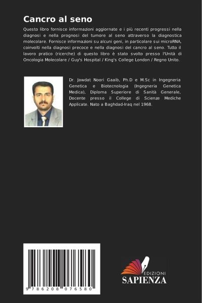 Questo libro fornisce informazioni aggiornate e i più recenti progressi nella diagnosi e nella prognosi del tumore al seno attraverso la diagnostica molecolare. Fornisce informazioni su alcuni geni, in particolare sui microRNA, coinvolti nella diagnosi precoce e nella diagnosi del cancro al seno. Tutto il lavoro pratico (ricerche) di questo libro è stato svolto presso l'Unità di Oncologia Molecolare / Guy's Hospital / King's College London / Regno Unito.