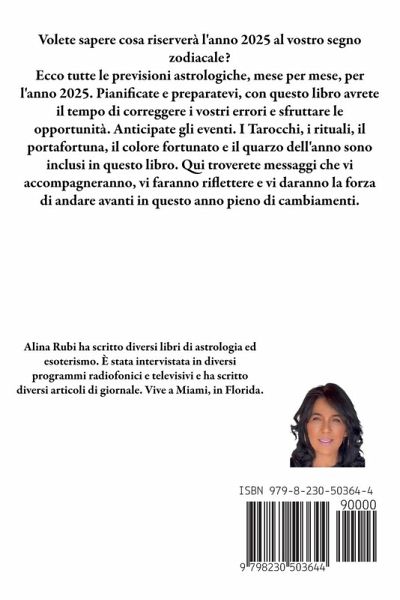 Volete sapere cosa riserverà l'anno 2025 al vostro segno zodiacale? Ecco tutte le previsioni astrologiche, mese per mese, per l'anno 2025. Pianificate e preparatevi, con questo libro avrete il tempo di correggere i vostri errori e sfruttare le opportunità. Anticipate gli eventi. I Tarocchi, i rituali, il portafortuna, il colore fortunato e il quarzo dell'anno sono inclusi in questo libro. Qui troverete messaggi che vi accompagneranno, vi faranno riflettere e vi daranno la forza di andare avanti in questo anno pieno di cambiamenti.