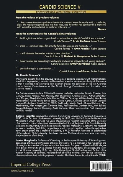 Candid Science V: Conversations with Famous Scientists contains 36 interviews with well-known scientists, including 19 Nobel laureates, Wolf Prize winners, and other luminaries. These in-depth conversations provide a glimpse into the greatest achievements in science during the past few decades, featuring stories of the discoveries, and showing the human drama behind them. The greatest scientists are brought into close human proximity as if readers were having a conversation with them. This volume departs from the previous ones in that it contains interviews with mathematicians in addition to physicists, chemists, and biomedical scientists. Another peculiarity of this volume is that it includes nine interviews from another project, the collection of the late Clarence Larson, former Commissioner of the Atomic Energy Commission and his wife, Jane ("Larson Tapes"). The 36 interviewees include famous personalities of our time, such as Donald Coxeter, John Conway, Roger Penrose, Alan Mackay, Dan Shechtman, Charles Townes, Arthur Schawlow, Leon Cooper, Alexei Abrikosov, Luis Alvarez, William Pickering, William Fowler, Vera Rubin, Neta Bahcall, Rudolf Peierls, Emilio Segre, Harold Agnew, Clarence Larson, Nelson Leonard, Princess Chulabhorn, Linus Pauling, Miklos Bodanszky, Melvin Calvin, Donald Huffman Alan MacDiarmid, Alan Heeger, Jens Christian Skou, Paul Lauterbur, Gunther Stent, John Sulston, Renato Dulbecco, Baruch Blumberg, Arvid Carlsson, Oleh Hornykiewicz, Paul Greengard, and Eric Kandel.