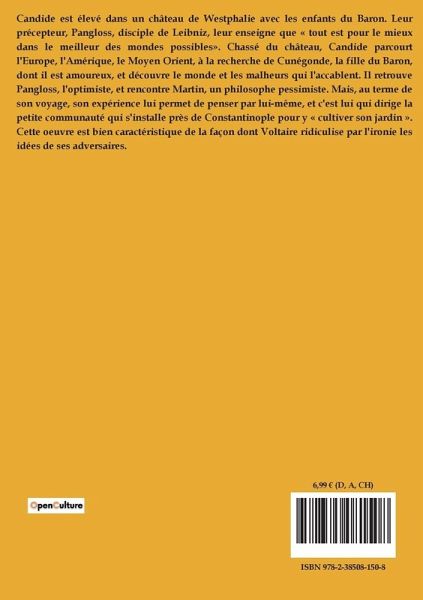 Candide est élevé dans un château de Westphalie avec les enfants du Baron. Leur précepteur, Pangloss, disciple de Leibniz, leur enseigne que « tout est pour le mieux dans le meilleur des mondes possibles». Chassé du château, Candide parcourt l'Europe, l'Amérique, le Moyen Orient, à la recherche de Cunégonde, la fille du Baron, dont il est amoureux, et découvre le monde et les malheurs qui l'accablent. Il retrouve Pangloss, l'optimiste, et rencontre Martin, un philosophe pessimiste. Mais, au terme de son voyage, son expérience lui permet de penser par lui-même, et c'est lui qui dirige la petite communauté qui s'installe près de Constantinople pour y « cultiver son jardin ». Cette oeuvre est bien caractéristique de la façon dont Voltaire ridiculise par l'ironie les idées de ses adversaires.