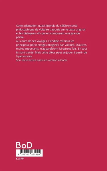 Cette adaptation quasi littérale du célèbre conte philosophique de Voltaire, Candide s'appuie sur le texte original et les dialogues vifs qui en composent une grande partie. L'action est ici découpée en 5 tableaux. Ils correspondent à 5 étapes importantes du périple de Candide, depuis l'Allemagne au château de Thunder-Ten-Tronck jusqu'à Constantinople et la célèbre conclusion finale « il faut cultiver notre jardin ».Au cours de ses voyages, Candide côtoiera les principaux personnages imaginés par Voltaire : Pangloss, Cunégonde, Paquette, Cacambo, Frère Giroflée, le philosophe Martin, la Vieille, etc. D'autres, moins importants, n'apparaîtront qu'une fois. En tout ils sont trente ! Mais lors de la création de cette adaptation sur scène, nous étions seulement dix à jouer. Un tableau au début du livre détaille les personnages nécessaires par scène. On peut ainsi constater que ce texte pourrait même être interprété à seulement 9 acteurs et actrices.Signalons enfin que ce texte existe aussi en version e-book.
