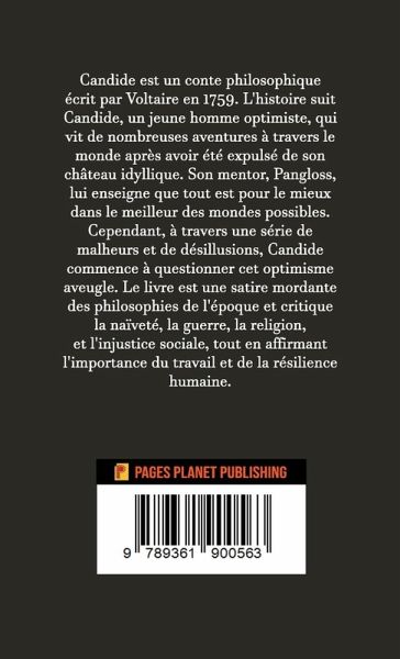 Candide est un conte philosophique écrit par Voltaire en 1759. L'histoire suit Candide, un jeune homme optimiste, qui vit de nombreuses aventures à travers le monde après avoir été expulsé de son château idyllique. Son mentor, Pangloss, lui enseigne que tout est pour le mieux dans le meilleur des mondes possibles. Cependant, à travers une série de malheurs et de désillusions, Candide commence à questionner cet optimisme aveugle. Le livre est une satire mordante des philosophies de l'époque et critique la naïveté, la guerre, la religion, et l'injustice sociale, tout en affirmant l'importance du travail et de la résilience humaine.