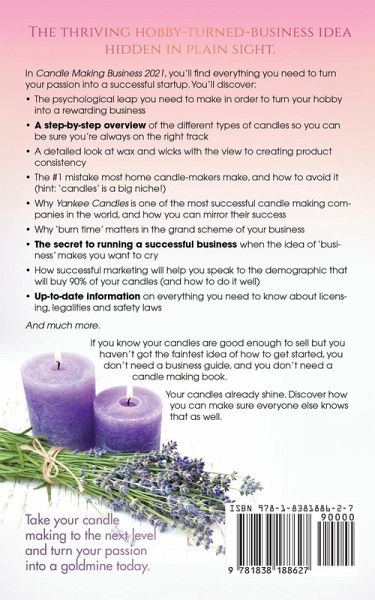 The thriving hobby-turned-business idea hidden in plain sight. About 70% of US households use candles. Just stop and think about the size of that market for a second. If you're a home candle maker, you could be sitting on a gold mine you haven't yet unearthed. There are candles for just about every market you can imagine: novelty candles for gifts; aromatherapy candles for relaxation; household candles for practical lighting; elegant tapers for fancy dinners; floating candles to create ambience... the list is endless. But then, you already know that. The problem most candle makers face is not how to make candles: there are hundreds of books out there for that. The problem is how to turn those candles into a lucrative income stream. The problem is figuring out how to continue to do what you love while selling hand-crafted candles that you can guarantee are safe and high quality. Every. Single. Time. That means you need up-to-date information on licensing, legal requirements, and setting up the business side of things when what you're really passionate about is making candles. In Candle Making Business 2021, you'll find everything you need to turn your passion into a successful startup. You'll discover:The psychological leap you need to make in order to turn your hobby into a rewarding business A step-by-step overview of the different types of candles so you can be sure you're always on the right track A detailed look at wax and wicks with the view to creating product consistency The #1 mistake most home candle-makers make, and how to avoid it (hint: 'candles' is a big niche!) Why Yankee Candle is one of the most successful candle making companies in the world, and how you can mirror their success Why 'burn time' matters in the grand scheme of your business The secret to running a successful business when the idea of 'business' makes you want to cry How successful marketing will help you speak to the demographic that will buy 90% of your candles (and how to do it well) Up-to-date information on everything you need to know about licensing, legalities and safety laws And much more. If you know your candles are good enough to sell but you haven't got the faintest idea of how to get started, you don't need a business guide, and you don't need a candle making book. You need to know the business information that's relevant to your candles, and you need to know how to use it. The candle market is a hugely lucrative niche, and there's a place for you within it. You simply need to find that place and learn how to make your candles stand out from the crowd, safe in the knowledge that you can guarantee product consistency and a quality that rivals the most successful sellers in the field. Your candles already shine. Discover how you can make sure everyone else knows that as well. If you're ready to take your candle making to the next level and turn your passion into a goldmine, then scroll up and click "Add to Cart" right now.
