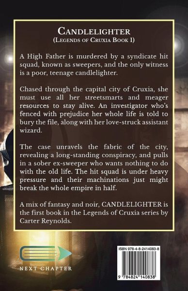 A High Father is murdered by a syndicate hit squad, known as sweepers, and the only witness is a poor, teenage candlelighter. Chased through the capital city of Cruxia, she must use all her streetsmarts and meager resources to stay alive. An investigator who's fenced with prejudice her whole life is told to bury the file, along with her love-struck assistant wizard. The case unravels the fabric of the city, revealing a long-standing conspiracy, and pulls in a sober ex-sweeper who wants nothing to do with the old life. The hit squad is under heavy pressure and their machinations just might break the whole empire in half. A mix of fantasy and noir, CANDLELIGHTER is the first book in the Legends of Cruxia series by Carter Reynolds.