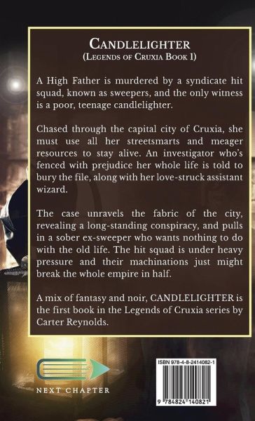 A High Father is murdered by a syndicate hit squad, known as sweepers, and the only witness is a poor, teenage candlelighter. Chased through the capital city of Cruxia, she must use all her streetsmarts and meager resources to stay alive. An investigator who's fenced with prejudice her whole life is told to bury the file, along with her love-struck assistant wizard. The case unravels the fabric of the city, revealing a long-standing conspiracy, and pulls in a sober ex-sweeper who wants nothing to do with the old life. The hit squad is under heavy pressure and their machinations just might break the whole empire in half. A mix of fantasy and noir, CANDLELIGHTER is the first book in the Legends of Cruxia series by Carter Reynolds.