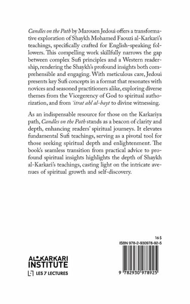 Candles on the Path by Marouen Jedoui offers a transformative exploration of Shaykh Mohamed Faouzi al-Karkari's teachings, specifically crafted for English-speaking followers. This compelling work skillfully narrows the gap between complex Sufi principles and a Western readership, rendering the Shaykh's profound insights both comprehensible and engaging. With meticulous care, Jedoui presents key Sufi concepts in a format that resonates with novices and seasoned practitioners alike, exploring diverse themes from the Vicegerency of God to spiritual authorization, and from `itrat ahl al-bayt to divine witnessing. As an indispensable resource for those on the Karkariya path, Candles on the Path stands as a beacon of clarity and depth, enhancing readers' spiritual journeys. It elevates fundamental Sufi teachings, serving as a pivotal tool for those seeking spiritual depth and enlightenment. The book's seamless transition from practical advice to profound spiritual insights highlights the depth of Shaykh al-Karkari's teachings, casting light on the intricate avenues of spiritual growth and self-discovery.