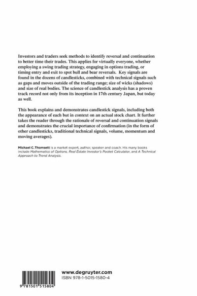 This book explains and demonstrates candlestick signals, including both the appearance of each but in context on an actual stock chart. It further takes the reader through the rationale of reversal and continuation signals and demonstrates the crucial importance of confirmation (in the form of other candlesticks, traditional technical signals, volume, momentum and moving averages).