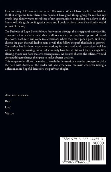 Candus' story: Life reminds me of a rollercoaster. When I have reached the highest thrill, it drops me faster than I can handle. I have good things going for me, but my overly-large family wants to rob me of my opportunities by making me a slave to the household. My goals are fingertips away, and I could achieve them if my family would get out of the way. The Pathway of Light Series follows four youths through the struggles of everyday life. These teens interact with each other in all four stories, but they have a powerful tale of their own. Each teen will come to a crossroads where they must pick a path. Will they choose the path that will lead to pain, or will they follow the path that leads to growth? The author has firsthand experience working in youth and adult corrections and has witnessed the devastating impact of seemingly harmless decisions. Often, a single life-altering choice can have massive consequences. As dreams shatter, the offender would give anything to change their past to make a better decision. This unique series allows the reader to watch the devastation when the protagonist picks the path with darkness. The reader will also experience the main character taking a different, more hopeful direction: the pathway of light.