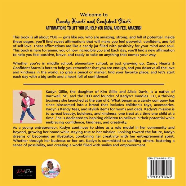 Welcome to Candy Hearts and Confident Starts: Affirmations to Lift You Up, Help You Grow, and Feel Amazing! This book is all about YOU - girls like you who are amazing, strong, and full of potential. Inside these pages, you'll find sweet affirmations that will make you feel powerful, confident, and full of self-love. These affirmations are like a candy jar filled with positivity for your mind and soul. This book is here to remind you of how incredible you are! Each day, you'll find a new affirmation to help you feel positive, brave, and ready to take on anything that comes your way. Whether you're in middle school, elementary school, or just growing up, Candy Hearts & Confident Starts is here to help you remember that you are enough, and you deserve all the love and kindness in the world, so grab a pencil or marker, find your favorite place, and let's start each day with a big smile and a heart full of confidence! Kadyn Gillie, the daughter of Kim Gillie and Alicia Davis, is a native of Barnwell, SC, and the CEO and founder of Kadyn's Kandies LLC, a thriving business she launched at the age of 6. What began as a candy company has since blossomed into a brand that includes children's toys, accessories, Kadyn's Kandy Tees, and stylish items for moms and dads. Kadyn's mission is to spread beauty, boldness, and kindness, one treat at a time one child at a time. She is dedicated to inspiring children to believe in their potential while embracing confidence, kindness, and creativity. As a young entrepreneur, Kadyn continues to shine as a role model in her community and beyond, growing her brand while staying true to her mission. Looking toward the future, Kadyn dreams of becoming an illustrator, combining her creativity with her entrepreneurial spirit. Whether through her business or her art, Kadyn is committed to uplifting others, fostering a sense of possibility, and creating a world filled with smiles and empowerment.
