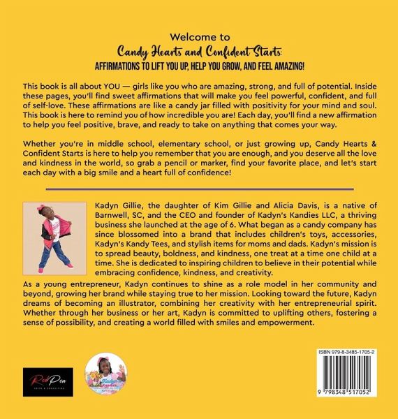 Welcome to Candy Hearts and Confident Starts: Affirmations to Lift You Up, Help You Grow, and Feel Amazing! This book is all about YOU - girls like you who are amazing, strong, and full of potential. Inside these pages, you'll find sweet affirmations that will make you feel powerful, confident, and full of self-love. These affirmations are like a candy jar filled with positivity for your mind and soul. This book is here to remind you of how incredible you are! Each day, you'll find a new affirmation to help you feel positive, brave, and ready to take on anything that comes your way. Whether you're in middle school, elementary school, or just growing up, Candy Hearts & Confident Starts is here to help you remember that you are enough, and you deserve all the love and kindness in the world, so grab a pencil or marker, find your favorite place, and let's start each day with a big smile and a heart full of confidence! Kadyn Gillie, the daughter of Kim Gillie and Alicia Davis, is a native of Barnwell, SC, and the CEO and founder of Kadyn's Kandies LLC, a thriving business she launched at the age of 6. What began as a candy company has since blossomed into a brand that includes children's toys, accessories, Kadyn's Kandy Tees, and stylish items for moms and dads. Kadyn's mission is to spread beauty, boldness, and kindness, one treat at a time one child at a time. She is dedicated to inspiring children to believe in their potential while embracing confidence, kindness, and creativity. As a young entrepreneur, Kadyn continues to shine as a role model in her community and beyond, growing her brand while staying true to her mission. Looking toward the future, Kadyn dreams of becoming an illustrator, combining her creativity with her entrepreneurial spirit. Whether through her business or her art, Kadyn is committed to uplifting others, fostering a sense of possibility, and creating a world filled with smiles and empowerment.