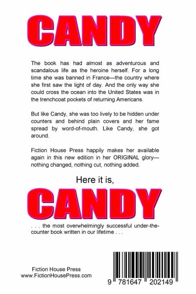 "DADDY!" cried Candy, but it was too late, for he swung the chair down at Emmanuel, who was leaping from the bed; it missed him and shattered against the bed-post. But he still retained a leg of the chair, and this, as a club, was a more formidable weapon than the chair itself, as he came relentlessly forward after the gardener, managing at last to speak through his grating teeth: "You... You... You..." The book has had almost as adventurous and scandalous life as the heroine herself. For a long time she was banned in France-the country where she first saw the light of day. And the only way she could cross the ocean into the United States was in the trenchcoat pockets of returning Americans. But like Candy, she was too lively to be hidden under counters and behind plain covers and her fame spread by word-of-mouth. Like Candy, she got around. Fiction House Press happily makes her available again in this new edition in her ORIGINAL glory-nothing changed, nothing cut, nothing added.