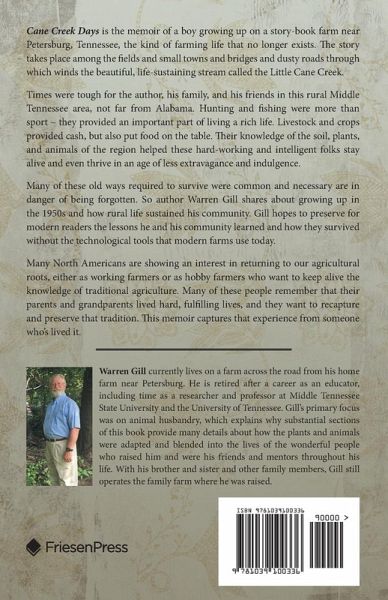 Cane Creek Days is the memoir of a boy growing up on a story-book farm near Petersburg, Tennessee, the kind of farming life that no longer exists. The story takes place among the fields and small towns and bridges and dusty roads through which winds the beautiful, life-sustaining stream called the Little Cane Creek. Times were tough for the author, his family, and his friends in this rural Middle Tennessee area, not far from Alabama. Hunting and fishing were more than sport - they provided an important part of living a rich life. Livestock and crops provided cash, but also put food on the table. Their knowledge of the soil, plants, and animals of the region helped these hard-working and intelligent folks stay alive and even thrive in an age of less extravagance and indulgence. Many of these old ways required to survive were common and necessary are in danger of being forgotten. So author Warren Gill shares about growing up in the 1950s and how rural life sustained his community. Gill hopes to preserve for modern readers the lessons he and his community learned and how they survived without the technological tools that modern farms use today. Many North Americans are showing an interest in returning to our agricultural roots, either as working farmers or as hobby farmers who want to keep alive the knowledge of traditional agriculture. Many of these people remember that their parents and grandparents lived hard, fulfilling lives, and they want to recapture and preserve that tradition. This memoir captures that experience from someone who's lived it.