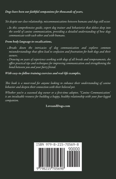Dogs have been our faithful companions for thousands of years, Yet despite our close relationship, miscommunications between humans and dogs still occur.In this comprehensive guide, expert dog trainer and behaviorist that delves deep into the world of canine communication, providing a detailed understanding of how dogs communicate with each other and with humans. From body language to vocalizations,Breaks down the intricacies of dog communication and explores common misunderstandings that often lead to confusion and frustration for both dogs and their owners. Drawing on years of experience working with dogs of all breeds and temperaments, she offers practical tips and techniques for improving communication and strengthening the bond between you and your furry friend. With easy-to-follow training exercises and real-life examples, This book is a must-read for anyone looking to enhance their understanding of canine behavior and deepen their connection with their beloved pet. Whether you're a seasoned dog owner or a first-time adopter, "Canine Communication" is an invaluable resource for building a happy, healthy relationship with your four-legged companion.