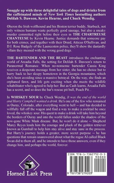 Snuggle up with three delightful tales of dogs and drinks from the minds of New York Times bestselling authors Delilah S. Dawson, Kevin Hearne, and Chuck Wendig. Oberon the Irish wolfhound and his Boston terrier buddy, Starbuck, not only witness humans waste perfectly good sausage, but also a sneaky murder committed right before their eyes in THE CHARTREUSE CHANTEUSE by Kevin Hearne. Justice demands that someone pay for both crimes, and together with their Druid, Atticus O'Sullivan, and D.I. Rose Badgely of the Launceston police, they'll show the dastardly villain they messed with the wrong good dogs. THE BARTENDER AND THE BEAST introduces the enchanting world of Arcadia Falls, the setting for Delilah S. Dawson's return to Paranormal Romance. When no-nonsense bartender Cassia King returns to her sleepy hometown in the Georgia mountains to help her sister, she can't help falling for well-dressed wildlife rehabilitator Riley. But as Cash learns, Arcadia Falls has a secret, and so does the bar's rescue pit bull, Peach Pit... In WHISKEY SOUR by Chuck Wendig, It was the end of the world and Harry Campbell wanted a drink. He's one of the few who remained in Ouray, Colorado, after everything went to hell -- and has decided to willfully fall off the wagon and find a way to make a cocktail he once loved, the whiskey sour. His quest to make a drink will take him beyond the borders of Ouray and into the world fallen under the shadow of the now-gone White Mask disease. But, he won't do it alone -- Shepherd Marcy Reyes lends him the courage and pluck of the golden retriever known as Gumball to help him stay alive and stay sane in the process. But Harry's journey holds a greater, more secret purpose -- he has questions that remain unanswered about what the rogue AI called Black Swan did to them all, and he intends to have those answers, even if they change him, and perhaps the world, forever.