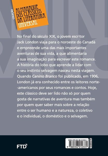 No final do século XIX, o jovem escritor norte-americano Jack London viaja para o noroeste do Canadá, onde o ouro foi recém-descoberto, e empreende uma das mais importantes aventuras de sua vida, a que alimentaria a sua imaginação para escrever esse romance. A história do lobo que luta contra seu instinto selvagem e se torna um animal doméstico nasceu da curiosidade e da coragem demonstradas pelo autor durante a exploração das diversas facetas humanas em meio a um cenário desolador de inverno rigoroso. Quando Canino Branco foi publicado, em 1906, London já era conhecido entre os leitores norte-americanos por seus contos e romances com base em suas viagens. Hoje, esse clássico deve ser lido não somente por quem gosta de narrativas de aventura, mas também por quem quer saber mais sobre a relação entre o homem e a natureza, o coletivo e o individual, o doméstico e o selvagem. Essa edição traz o texto Convite à leitura assinado pelo premiado jornalista José Hamilton Ribeiro.