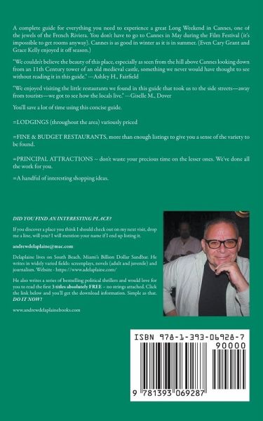 A complete guide for everything you need to experience a great Long Weekend in Cannes, one of the jewels of the French Riviera. You don't have to go to Cannes in May during the Film Festival (it's impossible to get rooms anyway). Cannes is as good in winter as it is in summer. (Even Cary Grant and Grace Kelly enjoyed it off season.) "We couldn't believe the beauty of this place, especially as seen from the hill above Cannes looking down from an 11th Century tower of an old medieval castle, something we never would have thought to see without reading it in this guide." ---Ashley H., Fairfield "We enjoyed visiting the little restaurants we found in this guide that took us to the side streets-away from tourists-we got to see how the locals live." ---Giselle M., Dover You'll save a lot of time using this concise guide. =LODGINGS (throughout the area) variously priced =FINE & BUDGET RESTAURANTS, more than enough listings to give you a sense of the variety to be found. =PRINCIPAL ATTRACTIONS -- don't waste your precious time on the lesser ones. We've done all the work for you. =A handful of interesting shopping ideas.