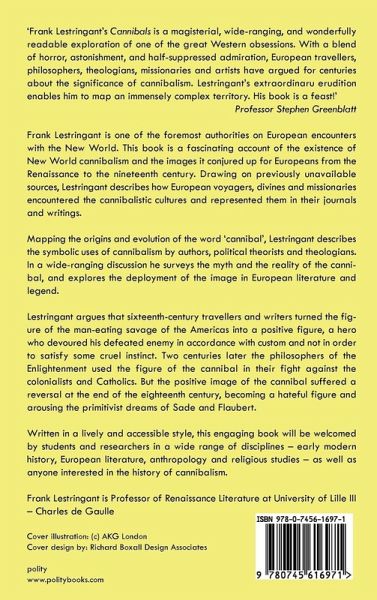 "Frank Lestringant's Cannibals is a magisterial,wide-ranging, and wonderfully readable exploration of one of thegreat Western obsessions. With a blend of horror, astonishment, andhalf-suppressed admiration, European travellers, philosophers,theologians, missionaries and artists have argued for centuriesabout the significance of cannibalism. Lestringant's extraordinaryerudition enables him to map an immensely complex territory. Hisbook is a feast!" Professor Stephen Greenblatt
