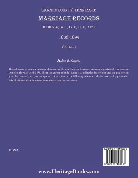 These documents contain marriage abstracts for Cannon County, Tennessee, arranged alphabetically by surname, spanning the years 1838-1899. Either the groom or bride's name is listed in the first column and the next column gives the name of that person's spouse. Information in the following columns includes book and page number, date of license (when purchased), and date of marriage or return.