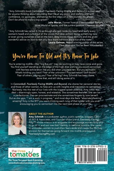 You're Never Too Old and It's Never Too Late You're entering midlife-the "big five-oh" may be looming or may have come and gone. You find yourself standing on the edge of the high dive wishing you could cannonball with fearless exhilaration like you did when you were ten. But you're frozen. What's holding you back? Fear of the unknown? Procrastination? Self-doubt? Fear of others judging you? Fear of failing? Amy Schmidt has been there, done that, and still doing some of it. In Cannonball, Fearlessly Facing Fifty, she shares her personal stories, and those of other women, to help arm us with insights and inspiration to cannonball fearlessly into the rest of our lives with the biggest splash possible. Amy is the real deal-disarmingly open, honest, and relatable. She sometimes feels fat. She can be a perfectionist. She can procrastinate and she sometimes forgets to love herself. But as she says, "I am a work in progress," and most days she feels "absolutelyfreaking" amazing. Amy is the BFF you want climbing each rung of that ladder with you and encouraging you to cannonball into the next best phase of your life.