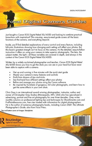 Introduction; Visual Tour; Quick Start: Up and Running in Five Minutes; Basic Principles of Good Photography; Part I: The Camera: Making Pictures; Viewing the Images; Menus; Cards, Readers, and Batteries; Part II: The Software: EOS Utility; Downloading Images; Using Your Computer to Set the Camera; Remote Shooting; Digital Photo Professional; The Edit Window; RAW Image Adjustment; Picture Styles; Adjusting Dynamic Range; RGB Image Adjustment; Picture Style Editor; ImageBrowser; Downloading Images; PhotoStitch; Part III: Light: Natural and Ambient; The Color of Light; Reflectors; Part IV: Lenses: EF14 mm f2.8 L USM Aspherical; 85 mm f1.2; 50 mm f2.5 Compact Macro; 100 mm f2.8 Macro; TS-E 90 mm f2.8 Tilt/Shift; EF70-200 mm f2.8 L USM; EF24-70 mm f 2.8 USM; EF24-105 f4 L; EF400 mm f2.8 L IS USM; EF-S Lenses; EF-S 17-55 mm f2.8 IS USM; EF-S 10-22 mm f3.5-4.5 USM; EF-S 17-85 f4-5.6 IS USM; EF-S 18-55 mm f3.5-5.6 IS USM; EF-S 60 mm f2.8 Macro USM; Part V: The Subjects: Pro Tips and Tricks for Great Images!; People; Travel; Pets and Wildlife; Humor; Part VI: Accessories: Accessory Flash; Multi Stroboscopic Flash; Speedlites in Studio or Location; Macro Twin Lite; Ring Lite; Camera Accessories; Printers; Other Accessories; Rebel Links; Index