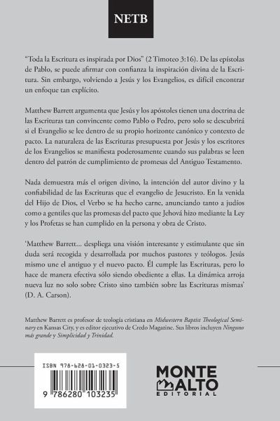 "Toda la Escritura es inspirada por Dios" (2 Timoteo 3:16). De las epístolas de Pablo, se puede afirmar con confianza la inspiración divina de la Escritura. Sin embargo, volviendo a Jesús y los Evangelios, es difícil encontrar un enfoque tan explícito. Matthew Barrett argumenta que Jesús y los apóstoles tienen una doctrina de las Escrituras tan convincente como Pablo o Pedro, pero solo se descubrirá si el Evangelio se lee dentro de su propio horizonte canónico y contexto de pacto. La naturaleza de la Escritura presupuesta por Jesús y los escritores de los Evangelios se manifiesta poderosamente cuando sus palabras se leen dentro del patrón de cumplimiento de promesas del Antiguo Testamento. Nada demuestra más el origen divino, la intención del autor divino y la confiabilidad de las Escrituras que el evangelio de Jesucristo. En la venida del Hijo de Dios, el Verbo se ha hecho carne, anunciando tanto a judíos como a gentiles que las promesas del pacto que Jehova hizo mediante la Ley y los Profetas se han cumplido en la persona y obra de Cristo. 'Matthew Barrett... despliega una visión interesante y estimulante que sin duda será recogida y desarrollada por muchos pastores y teólogos. Jesús mismo une el antiguo y el nuevo pacto. Él cumple las Escrituras, pero lo hace de manera efectiva sólo siendo obediente a ellas. La dinámica arroja nueva luz no solo sobre Cristo sino también sobre las Escrituras mismas' (D. A. Carson).