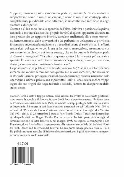 "Eppure, Carmen e Gilda sembravano perfette, insieme. Si mescolavano e si supportavano come le voci di un canone, e come le voci di un contrappunto si completavano, pur dicendo cose differenti, in un continuo e silenzioso dialogo d'amore e di rispetto". Carmen e Gilda sono l'una lo specchio dell'altra. Istintiva e passionale la prima, razionale e misurata la seconda, proprio in virtù di questa apparente distanza tra loro prende vita un rapporto intenso, carnale e intellettuale allo stesso momento, frenato, tuttavia, dalle convenzioni e dal perbenismo della gente di provincia, fortemente ancorata alla tradizione e a una distinzione di ruoli ormai, in effetti, senza alcun collegamento con la realtà. In questo senso, allora, assumono ancor più valore le parole con cui Anita Sonego, che ne ha curato la Prefazione, parla di Canoni e contrappunti: "La cifra di questo scritto è la sincerità più radicale e spietata. È la messa a nudo dei sentimenti anche quando appaiono, e forse sono, illogici, sconvenienti e portatori di frustrazioni". Dopo il successo di pubblico e critica di Perché non lei, Marisa Giaroli entra nuovamente nel mondo femminile con questo suo nuovo romanzo, che attraverso la storia di Carmen, protagonista assoluta e decisamente riuscita, narra non solo una vicenda intima e privata, ma soprattutto i limiti di una società ancora troppo legata alle sue origini che nega, testarda e assurda, l'amore tra due persone dello stesso sesso.
