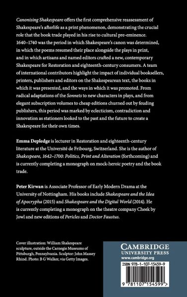 Canonising Shakespeare offers the first comprehensive reassessment of Shakespeare's afterlife as a print phenomenon, demonstrating the crucial role that the book trade played in his rise to cultural pre-eminence. 1640-1740 was the period in which Shakespeare's canon was determined, in which the poems resumed their place alongside the plays in print, and in which artisans and named editors crafted a new, contemporary Shakespeare for Restoration and eighteenth-century consumers. A team of international contributors highlight the impact of individual booksellers, printers, publishers and editors on the Shakespearean text, the books in which it was presented, and the ways in which it was promoted. From radical adaptations of the Sonnets to new characters in plays, and from elegant subscription volumes to cheap editions churned out by feuding publishers, this period was marked by eclecticism, contradiction and innovation as stationers looked to the past and the future to create a Shakespeare for their own times.