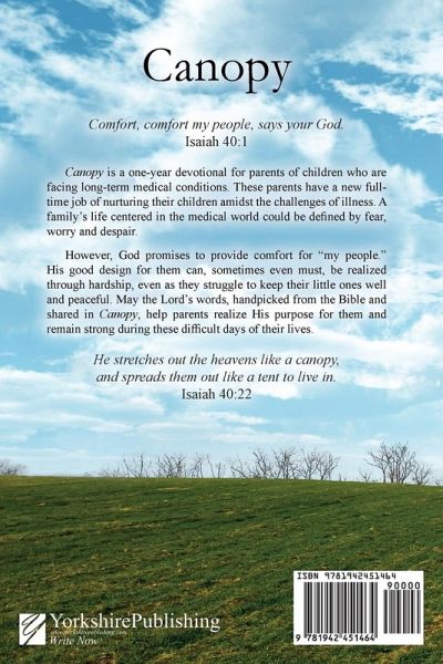 Canopy is a one-year devotional for parents of children who are facing long-term medical conditions. These parents have a new full-time job of nurturing their children amidst the challenges of illness. A family's life centered in the medical world could be defined by fear, worry and despair. However, God promises to provide comfort for "my people." His good design for them can, sometimes even must, be realized through hardship, even as they struggle to keep their little ones well and peaceful. May the Lord's words, handpicked from the Bible and shared in Canopy, help parents realize His purpose for them and remain strong during these difficult days of their lives. He stretches out the heavens like a canopy, and spreads them out like a tent to live in. Isaiah 40:22
