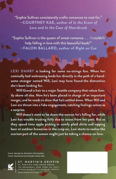 A struggling waitress and the heir to a major Seattle company stumble into a high-profile fake engagement while simultaneously trying to keep up with their own love lives in this flirty fall rom-com! Lexi Danby is looking for some no-strings, fall fun. Once a college track star, she was forced to drop out when her father passed away. Now she's trying to make ends meet while putting herself through school and caring for her grieving mother. When her comically bad waitressing lands her directly in the path of a handsome, charming stranger named Will, Lexi may just have found the distraction she's been looking for. Their first date looks promising until a misunderstanding at a party thrusts Lexi and Will into a fake engagement they can't talk themselves out of. And Will turns out to be a member of Seattle royalty. Will Grand is heir to a major company, and Seattle's most eligible bachelor. But he's been placed in charge of an important merger with a company that values family above all else, and needs to show them that he's settled down. While a fake engagement is advantageous from a business standpoint, it's not so great for a budding relationship with a woman who's wary of commitment. With a woman who Will is beginning to care about much more than he could have anticipated. As Lexi gets a taste of Will's glamorous world and the pair keeps up the pretense of their fake engagement for the press, they decide to see where a more casual relationship takes them out of the spotlight. And amid apple picking in comfy flannels, outdoor breweries in the crisp air, and fun Halloween preparations, Lexi starts to realize the scariest part of the season might just be taking a chance on love. "Sophie Sullivan consistently crafts romances to root for." -Courtney Kae, author of In the Event of Love and In the Case of Heartbreak