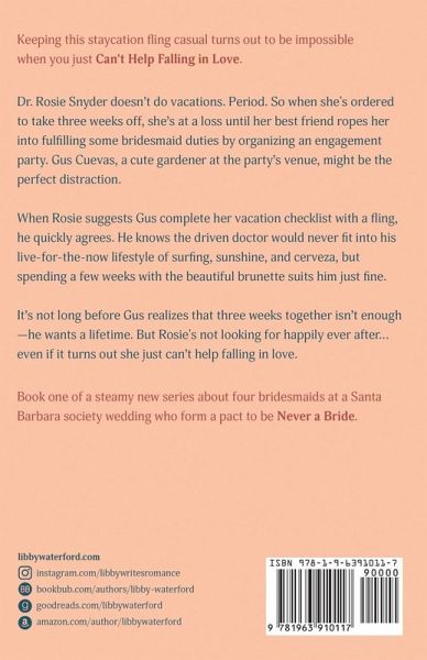 Keeping this staycation fling casual turns out to be impossible when you can't help falling in love. Dr. Rosie Snyder doesn't do vacations. Period. So when she's ordered to take three weeks off, she's at a loss until her best friend ropes her into fulfilling some bridesmaid duties by organizing an engagement party. Gus Cuevas, a cute gardener at the party's venue, might be the perfect distraction. When Rosie suggests Gus complete her vacation checklist with a fling, he quickly agrees. He knows the driven doctor would never fit into his live-for-the-now lifestyle of surfing, sunshine, and cerveza, but spending a few weeks with the beautiful brunette suits him just fine. It's not long before Gus realizes that three weeks together isn't enough-he wants a lifetime. But Rosie's not looking for happily ever after...even if it turns out she just can't help falling in love. This is the first book in the steamy, funny Never a Bride series. Each stand-alone story features one of four bridesmaids in a society Santa Barbara wedding.