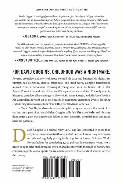 Over 5 million copies sold For David Goggins, childhood was a nightmare - poverty, prejudice, and physical abuse colored his days and haunted his nights. But through self-discipline, mental toughness, and hard work, Goggins transformed himself from a depressed, overweight young man with no future into a U.S. Armed Forces icon and one of the world's top endurance athletes. The only man in history to complete elite training as a Navy SEAL, Army Ranger, and Air Force Tactical Air Controller, he went on to set records in numerous endurance events, inspiring Outside magazine to name him The Fittest (Real) Man in America. In this curse-word-free edition of Can't Hurt Me, he shares his astonishing life story and reveals that most of us tap into only 40% of our capabilities. Goggins calls this The 40% Rule, and his story illuminates a path that anyone can follow to push past pain, demolish fear, and reach their full potential.